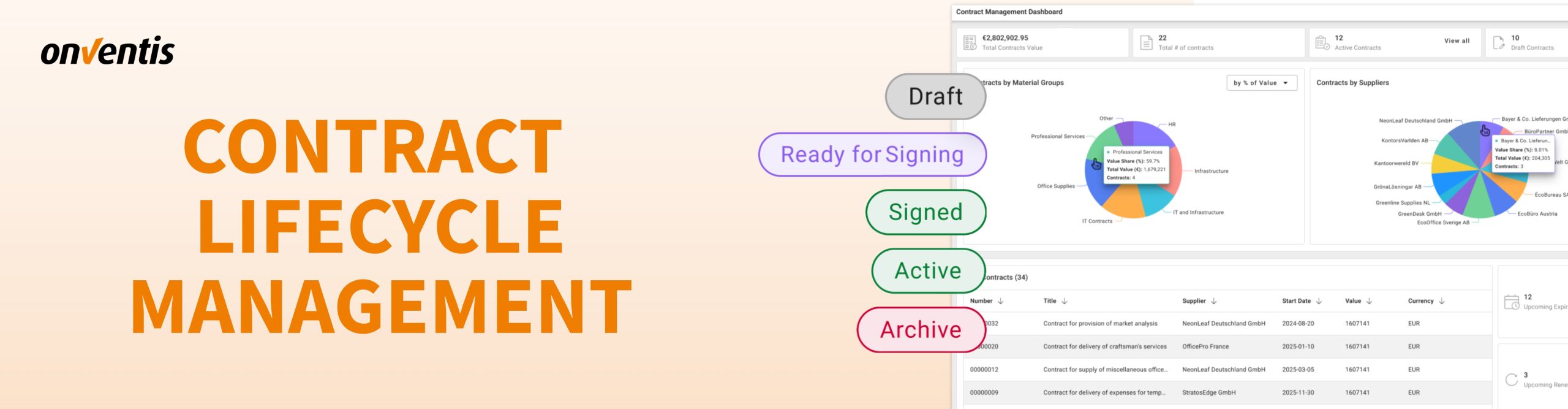 Onventis präsentiert das Contract Lifecycle Management (CLM)-Modul, eine neue cloudbasierte Lösung, die den gesamten Vertragslebenszyklus digitalisiert und automatisiert – von der ersten Anfrage und dem Entwurf über die Verhandlung, Genehmigung, Unterzeichnung und Verlängerung bis hin zur Archivierung. Die Lösung konsolidiert alle Verträge in ein zentrales, strukturiertes Archiv und bietet ein einheitliches Dashboard für einen sofortigen Überblick über Werte, Volumen, Ablaufdaten und Verlängerungen.
