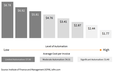 Außerdem sind die Verarbeitungskosten einer elektronischen Rechnung im Vergleich zu einer Rechnung, die per Post und/oder einer PDF-Rechnung per E-Mail eingeht, deutlich geringer. Wie das nachstehende Diagramm zeigt, führt eine zunehmende Automatisierung der Rechnungsverarbeitung zu einer proportionalen Senkung der Kosten pro Rechnung. Die Umstellung auf elektronische Rechnungen bedeutet also einen enormen Automatisierungsschub für Ihren internen Prozess, der auch die Bearbeitungskosten pro Rechnung für Ihr Unternehmen erheblich senkt.