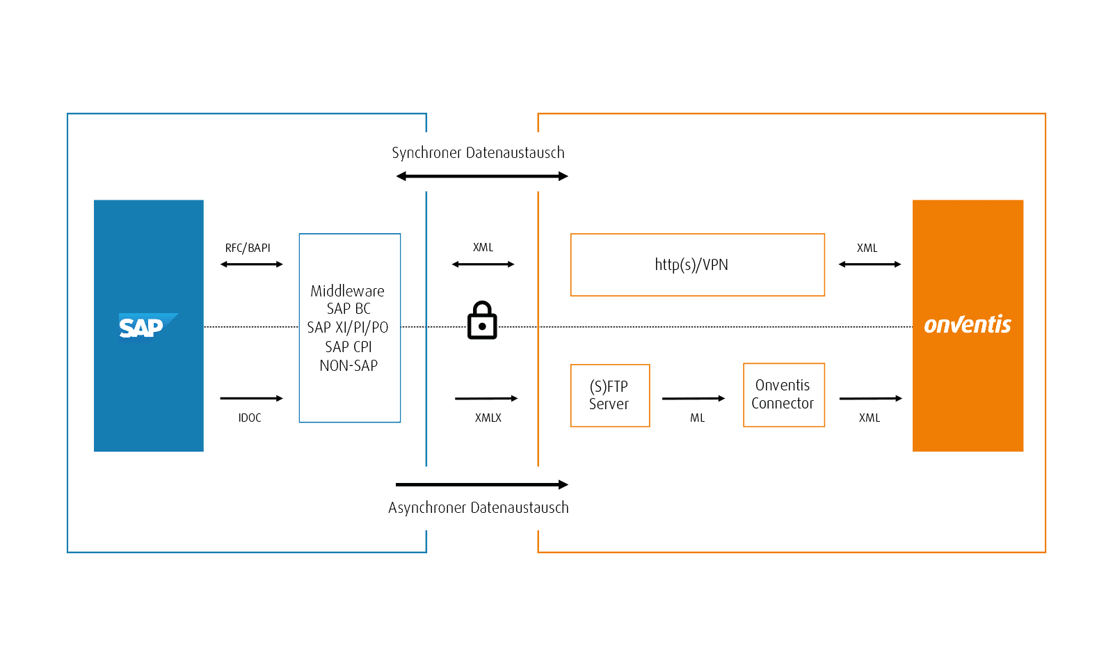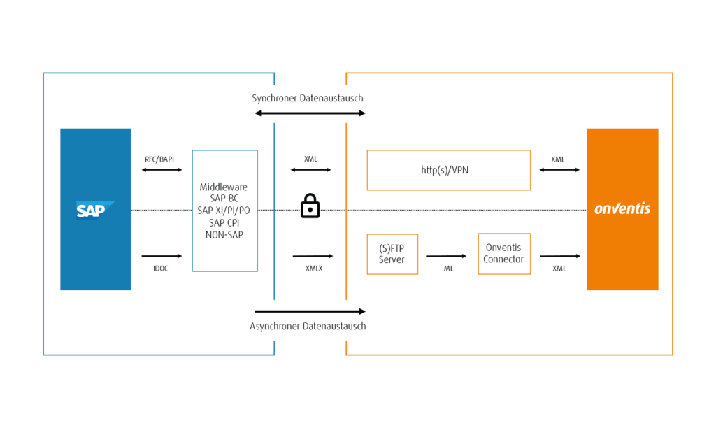 Mittels standardisierter Schnittstellen werden Informationen in Echtzeit zwischen Onventis und dem jeweiligen ERP-System abgeglichen.