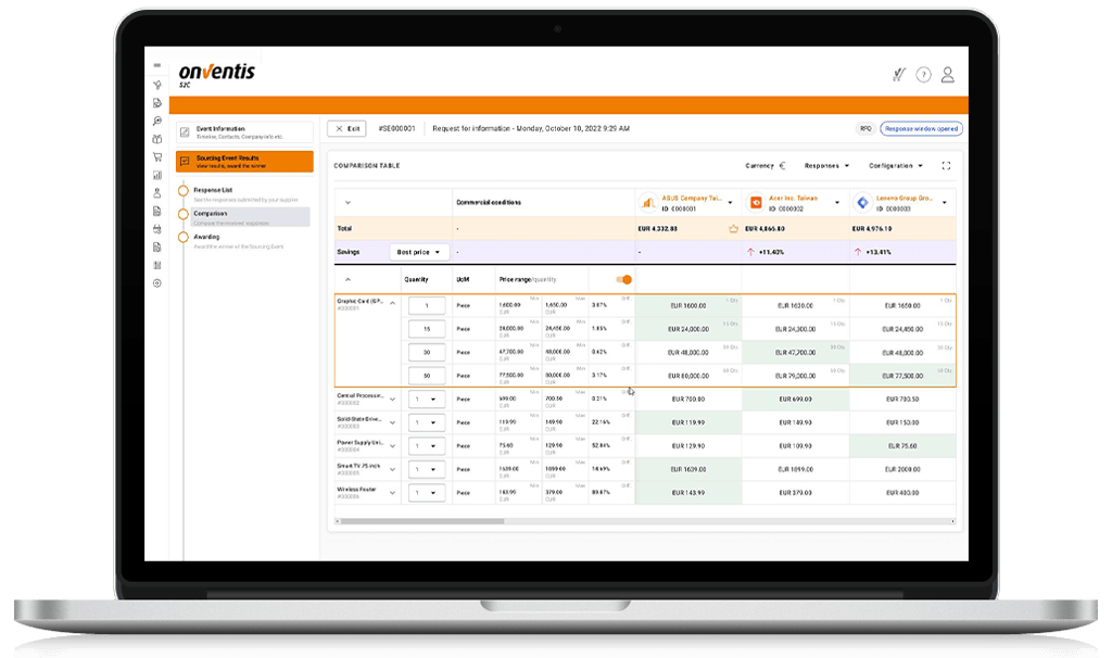Eine effiziente Bestellabwicklung ist sowohl für Einkäufer als auch Lieferanten essenziell. Unsere Source-to-Contract-Software bietet einen geführten Beschaffungsprozess, der auf Preisvergleichen oder beantworteten Produktfragen basiert. Unser System vereinfacht zudem die Vertragsverwaltung und gewährleistet zuverlässige Lieferketten sowie effiziente Beschaffungsprozesse.